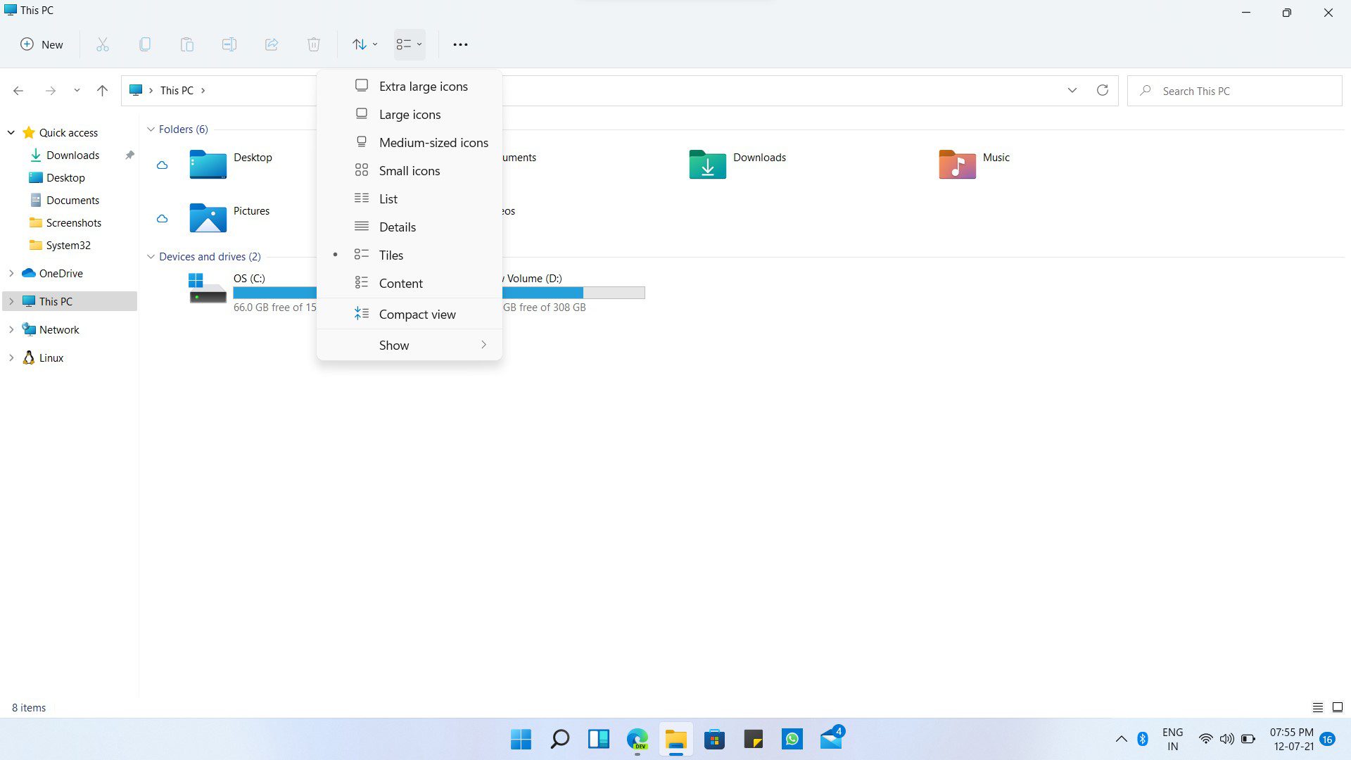 The options at the top menu have been made more straightforward, and now three menus can take care of everything primarily – Sort and Group, Layout and View, and see more(…). As the name suggests, Sort and group help sort the items like an opened folder; layout and view help customize the view like Large, minor, or Medium icons/compact view. The See more option has other options present on the main ribbon before, like Folder options, adding a network drive, etc.