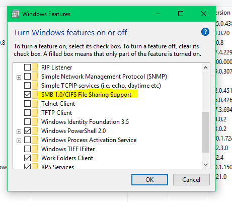 - In the new window that opens, uncheck the option SMB 1.0/CIFS File Sharing support